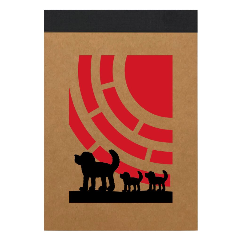 太陽をバックに歩く犬の親子のシルエットを描いたデザインをプリントした表紙のメモパッドです。