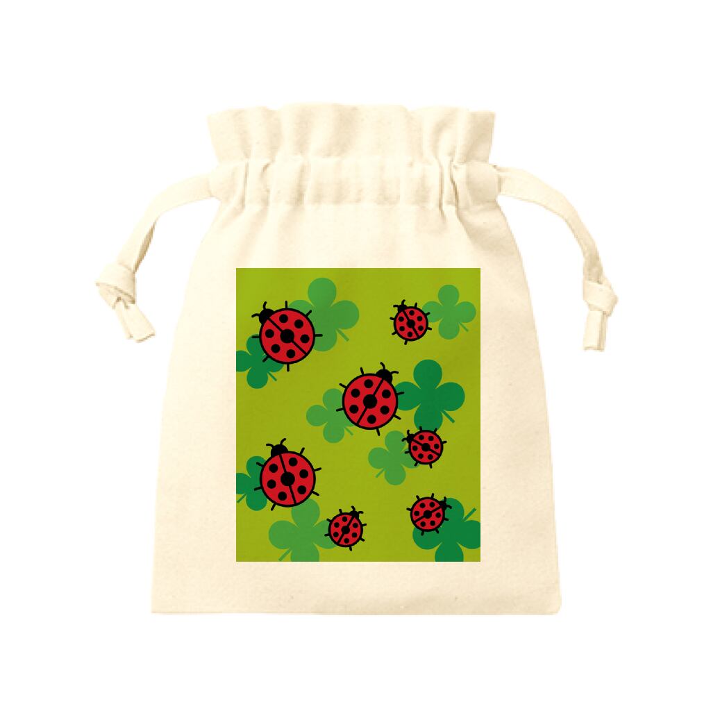 てんとうむしとクローバーのデザイン柄が入ったデザインをプリントした巾着袋です。