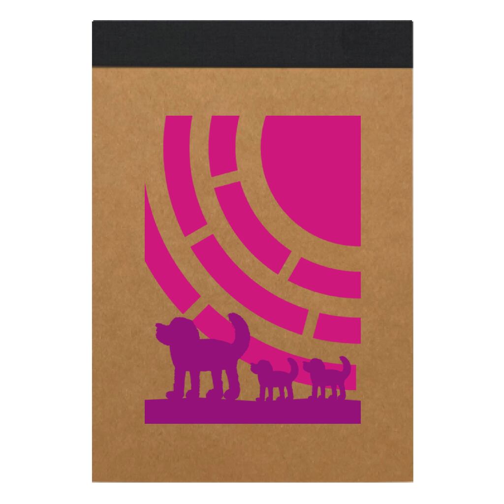 太陽をバックに歩く犬の親子のシルエットを描いたデザインをプリントした表紙のメモパッドです。