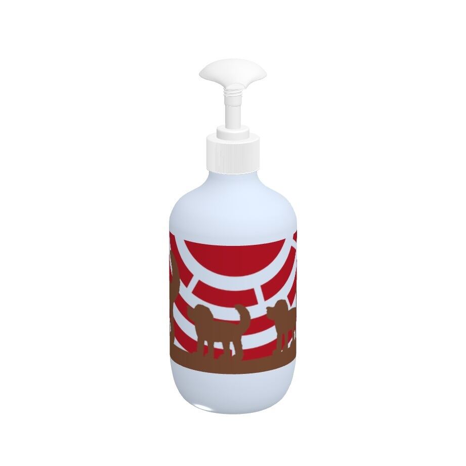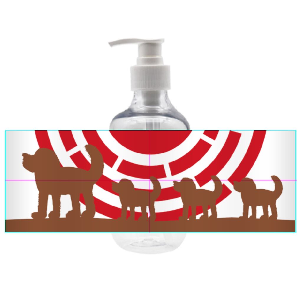 太陽をバックに歩く犬の親子のシルエットを描いたデザインをプリントしたシャンプーボトルです。