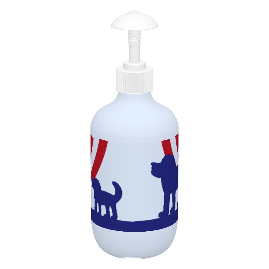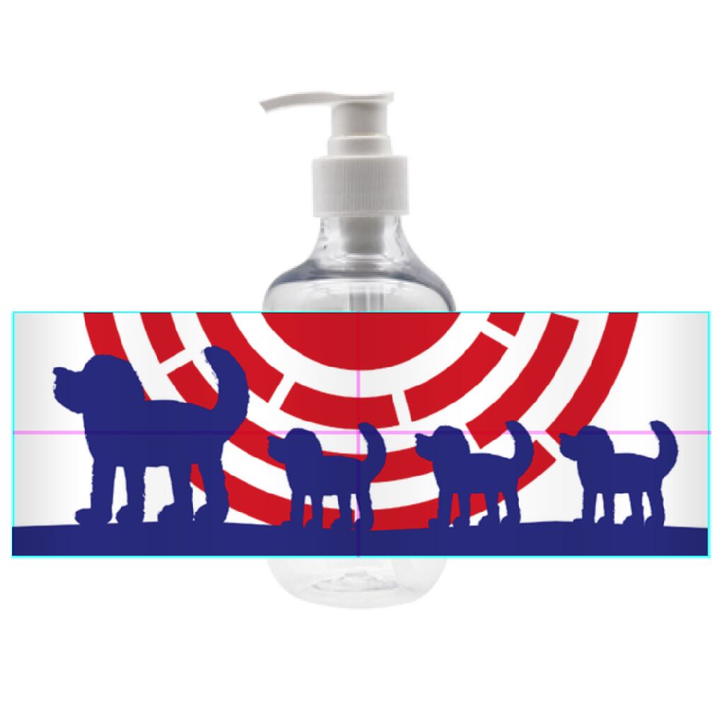 太陽をバックに歩く犬の親子のシルエットを描いたデザインをプリントしたシャンプーボトルです。