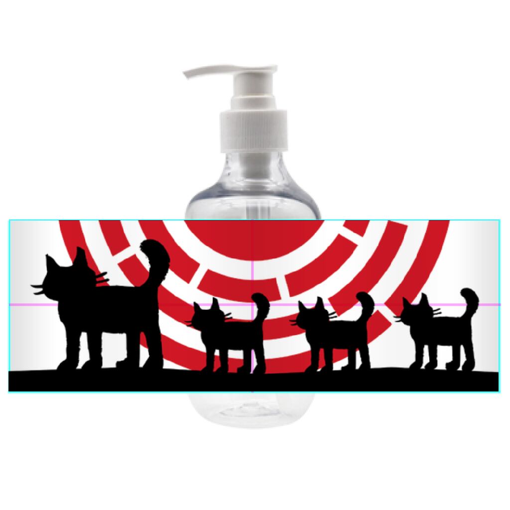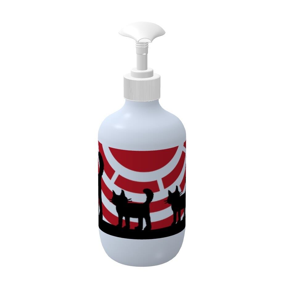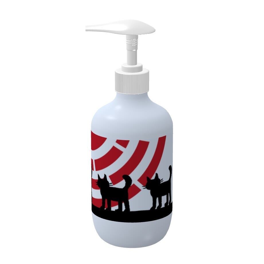 太陽をバックに歩く猫の親子のシルエットを描いたデザインをプリントしたシャンプーボトルです。