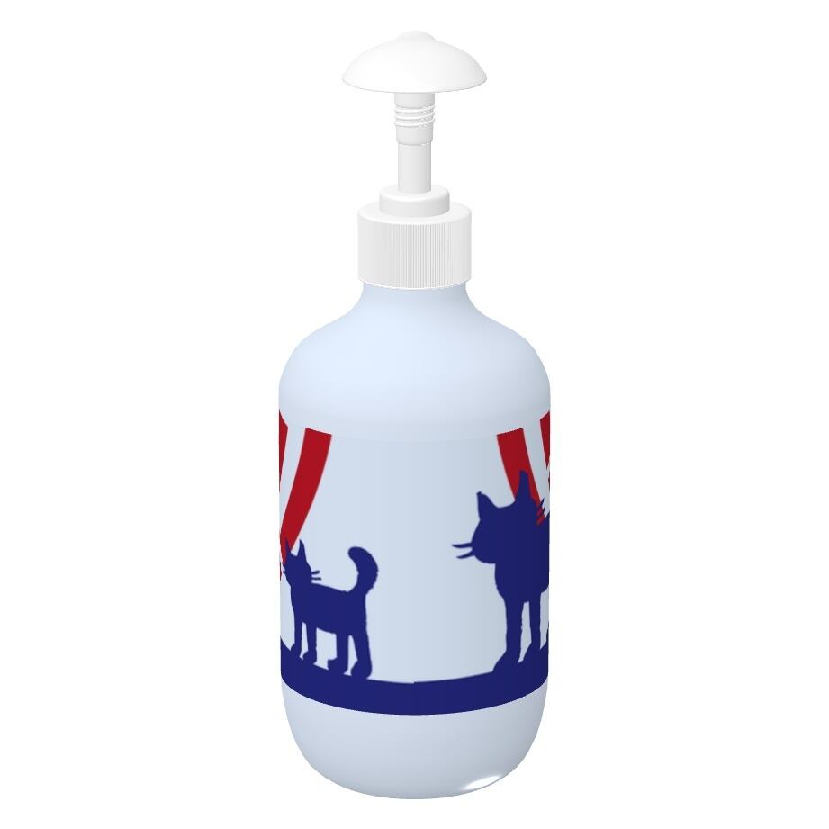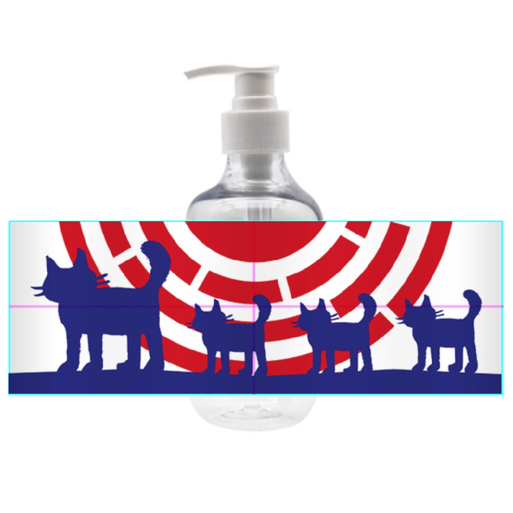 太陽をバックに歩く猫の親子のシルエットを描いたデザインをプリントしたシャンプーボトルです。