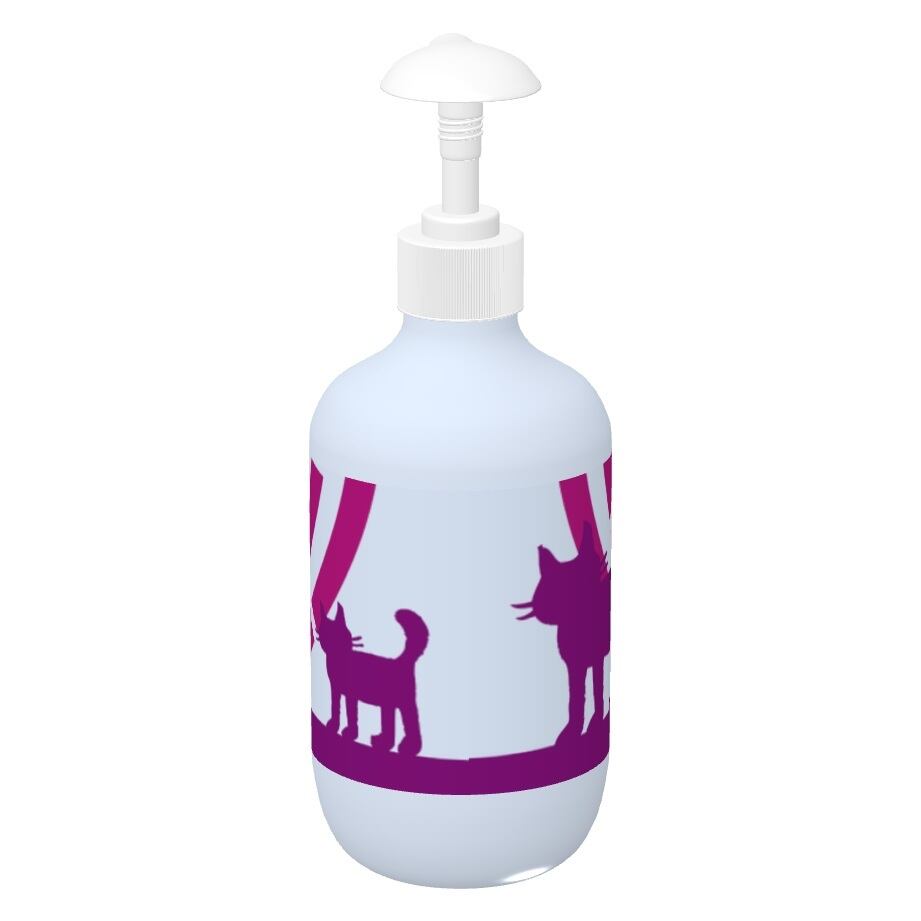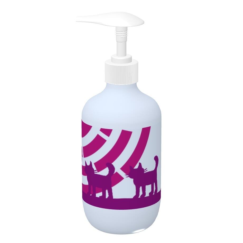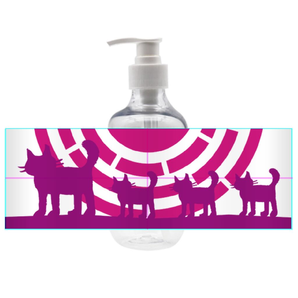 太陽をバックに歩く猫の親子のシルエットを描いたデザインをプリントしたシャンプーボトルです。